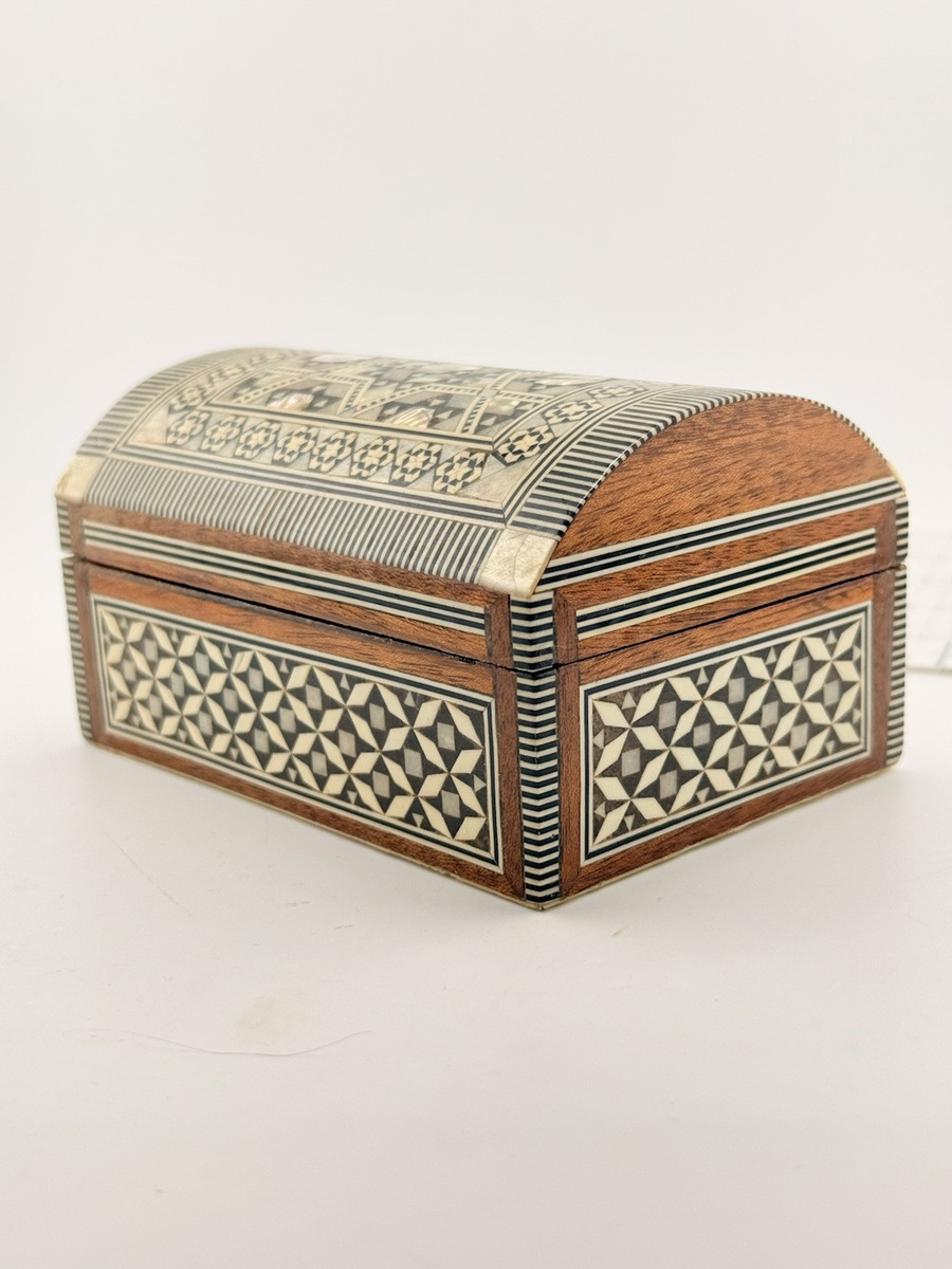 Mother-of-pearl inlay involves embedding small, thin pieces of iridescent shell—typically from mollusks—into carved-out sections of wood. The shell pieces are meticulously shaped and placed within intricate designs, ranging from geometric patterns to floral motifs and sometimes Arabic calligraphy, creating a visual play of light and depth.