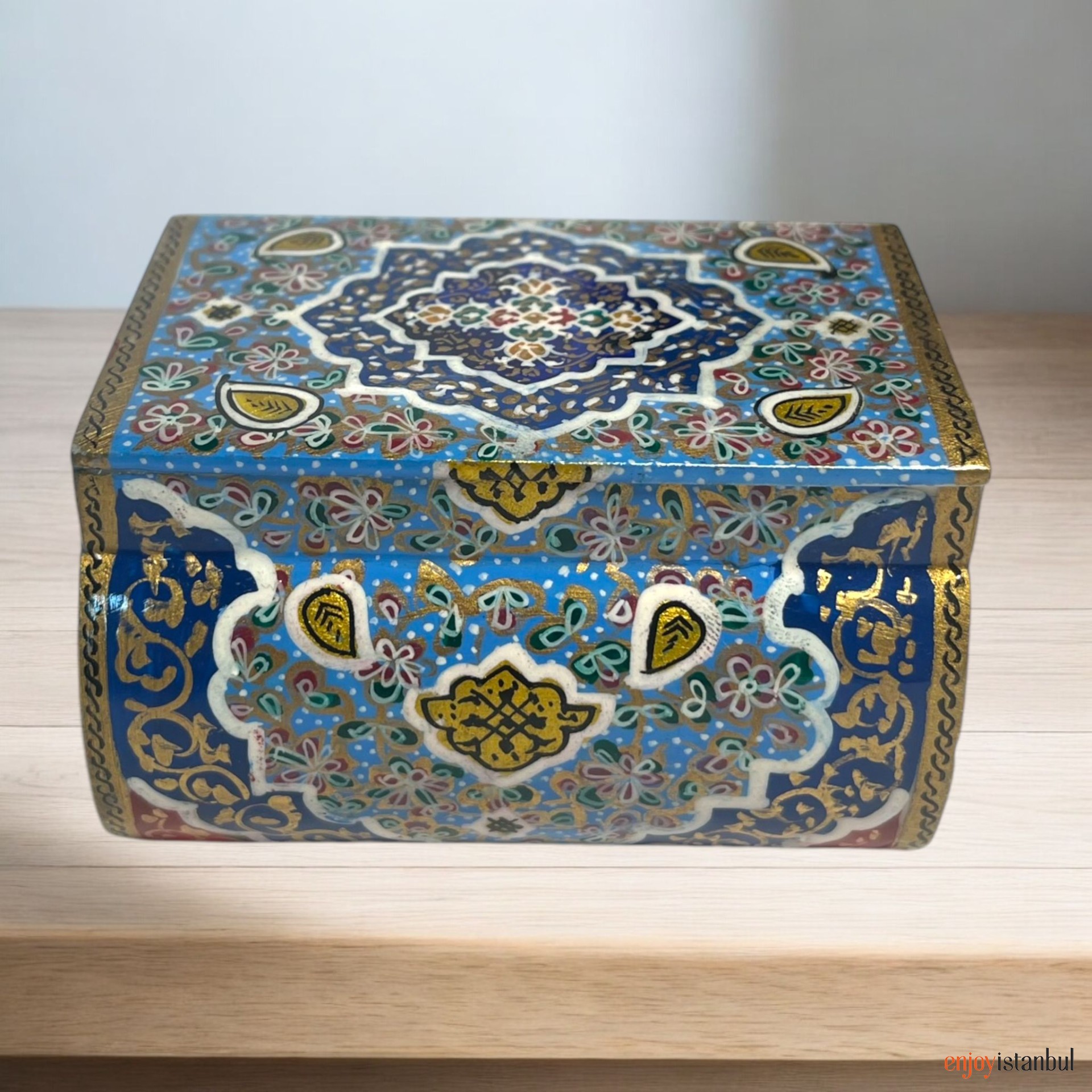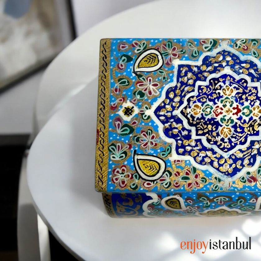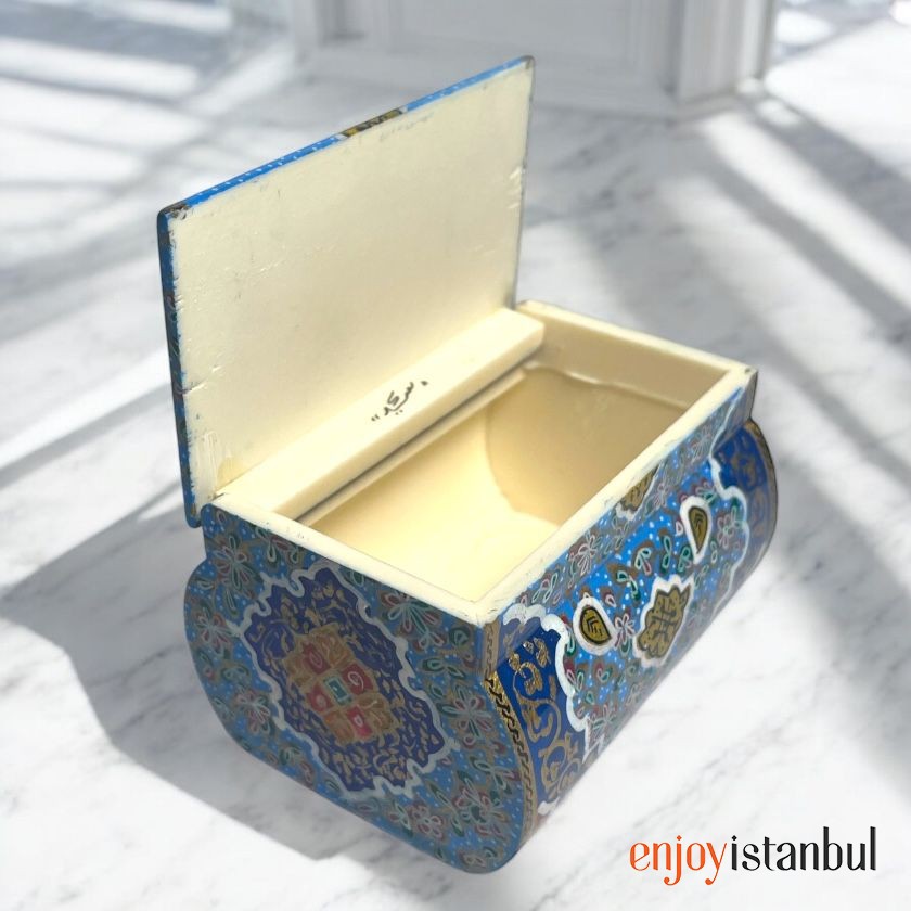 Exterior: The box is richly adorned with traditional Persian patterns in vibrant royal blue, dazzling gold, and accents of red, green, and white. The intricate floral and geometric motifs give it a timeless and luxurious appearance.