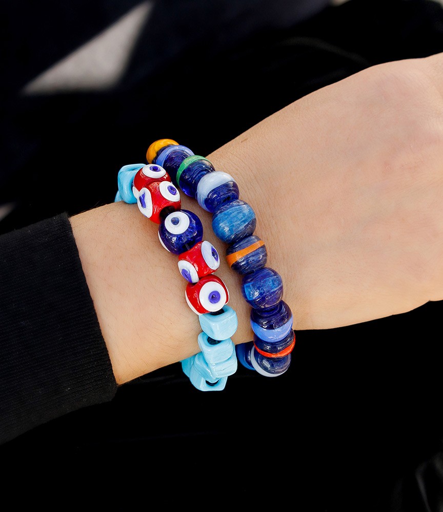 Our bracelets are crafted in vibrant colors, excellent shine and high aesthetic designs. Their designs are created by me and totally original and completely handmade. We have 2 bracelets together that mache each other perfectly, and adonerd with yellow evil eye beads.