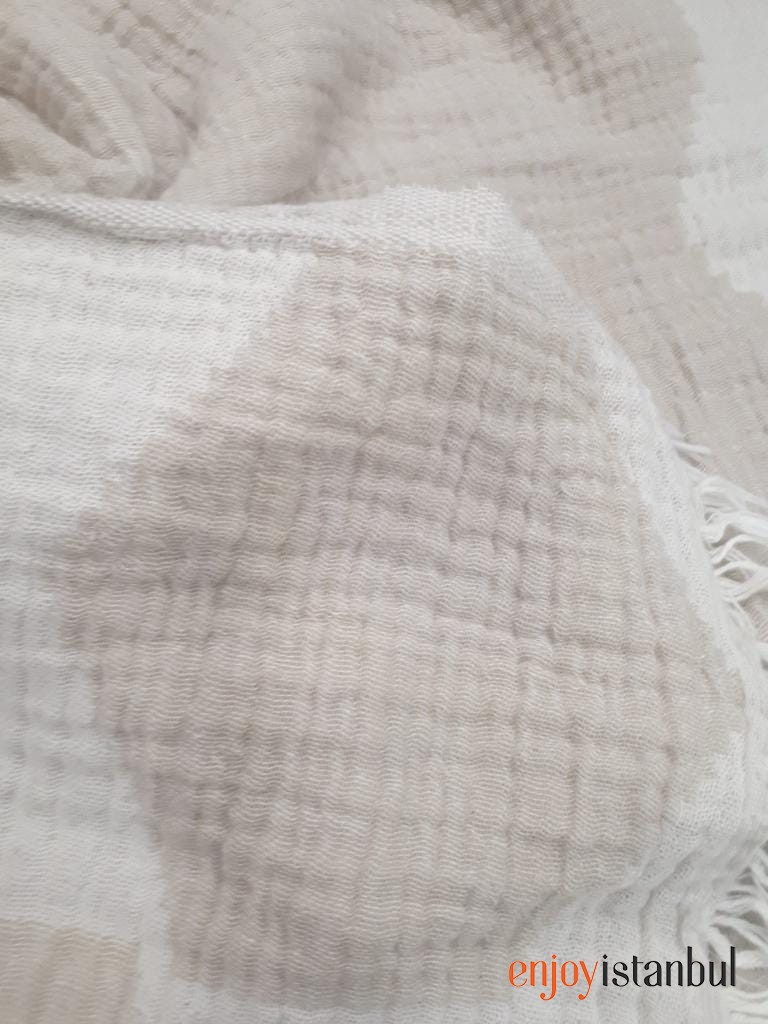 This bath towel presents a perfect example of modern elegance and simplicity. The geometric patterns accentuate the aesthetics of the towel, while the beige color represents warmth and natural elegance, and white symbolizes cleanliness and simplicity. These colors and patterns have a soothing effect after a bath, creating a sense of elegance.