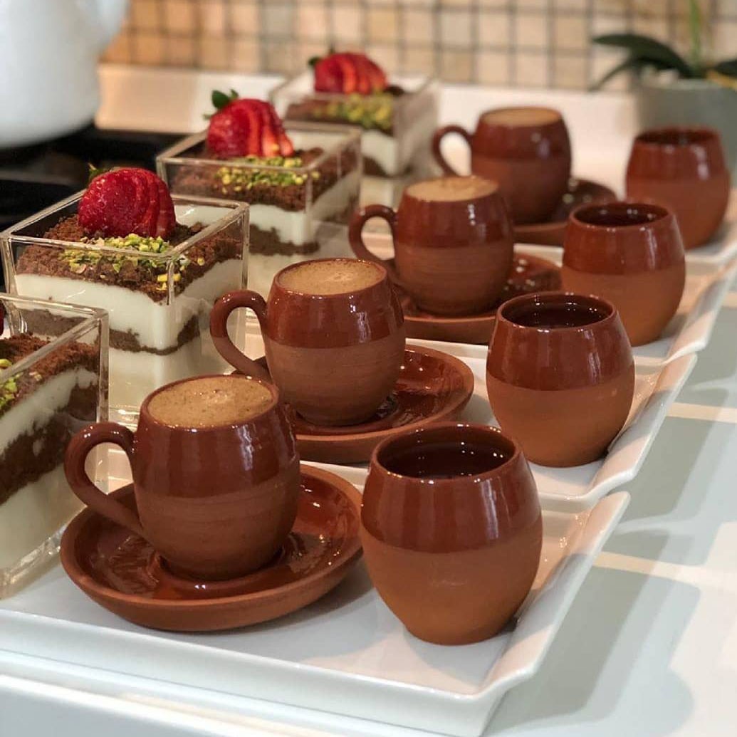 • Handmade in the city of Iznik, known as Nicaea in ancient times, and famed for its production of fritware (also called stonepaste or faience) since the 16th century.” Organic clay was used in making the cup set. Organic mud and natural glaze is used. Guaranteed lead-free and non-toxic, these cups are environmentally friendly. Due to the nature of the clay, it ensures that your drink remains hot for a long time. Holds about 2.7 ounces/80 ml./each. Dishwasher safe. Planning an event? These cups will add the perfect Continental touch to your breakfast or dinner table. Ask us about bulk-shipment discount.