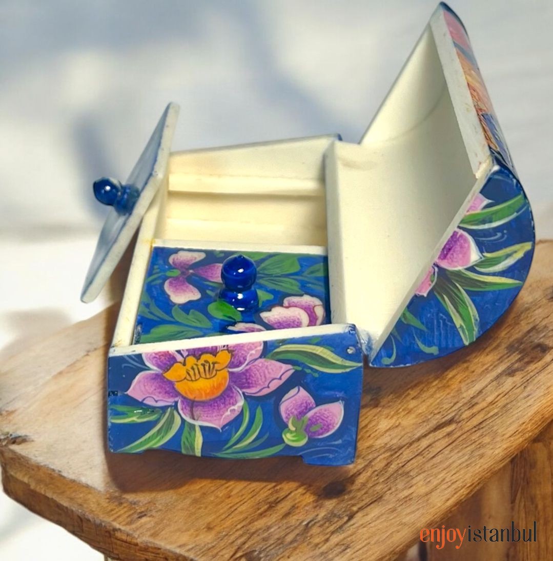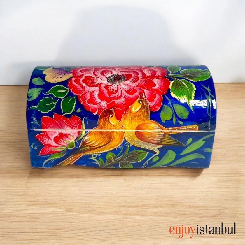 Discover the magic of art and the texture of elegance with our handcrafted wooden boxes. Each box is beautifully adorned with meticulously detailed Persian miniature art designs, featuring vibrant hand-painted lids and delicate bronze-like framing accents that captivate the eye. The carefully designed floral motifs on the side panels perfectly reflect Iran's rich cultural heritage and unmatched craftsmanship.