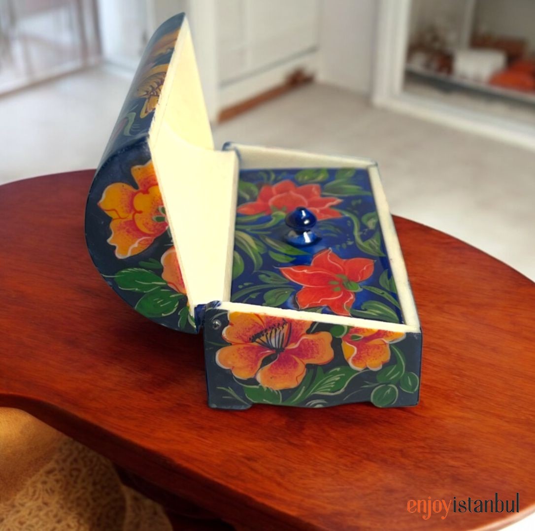 Discover the magic of art and the texture of elegance with our handcrafted wooden boxes. Each box is beautifully adorned with meticulously detailed Persian miniature art designs, featuring vibrant hand-painted lids and delicate bronze-like framing accents that captivate the eye. The carefully designed floral motifs on the side panels perfectly reflect Iran's rich cultural heritage and unmatched craftsmanship.