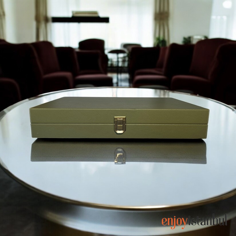 Elevate your game nights with this exquisite pistachio green faux leather backgammon set. Measuring 26 x 37.5 x 6.5 cm (approximately 10.2 x 14.8 x 2.6 inches), this compact set offers a perfect balance of style and functionality. It features finely crafted checkers in harmonious tones, premium dice, and two matching pistachio faux leather dice cups for a refined gaming experience. Its durable and travel-friendly design makes it ideal for both home use and gifting, adding a touch of sophistication to any setting.