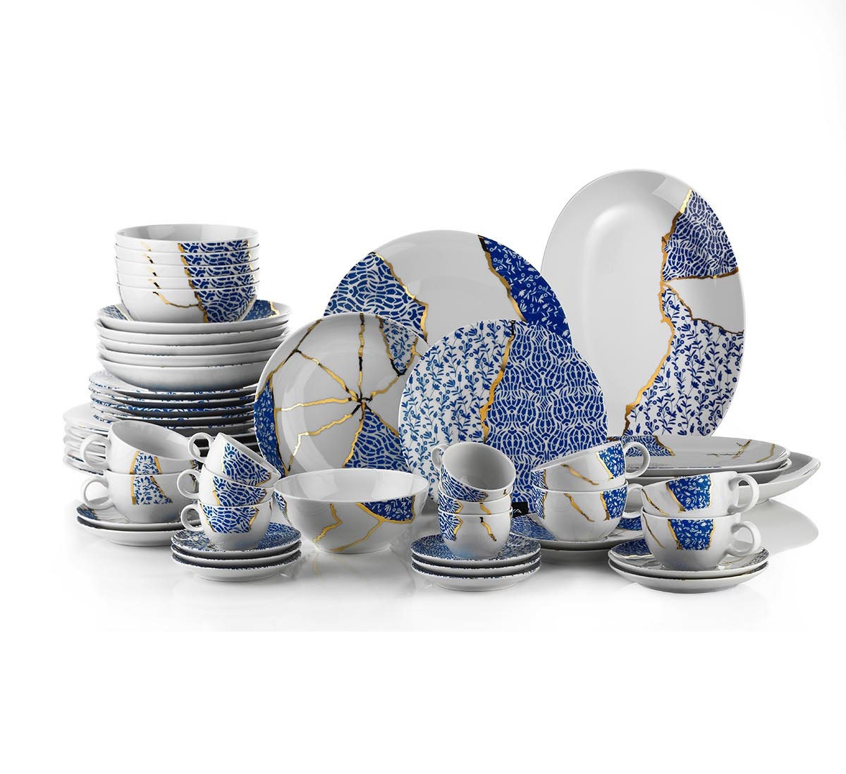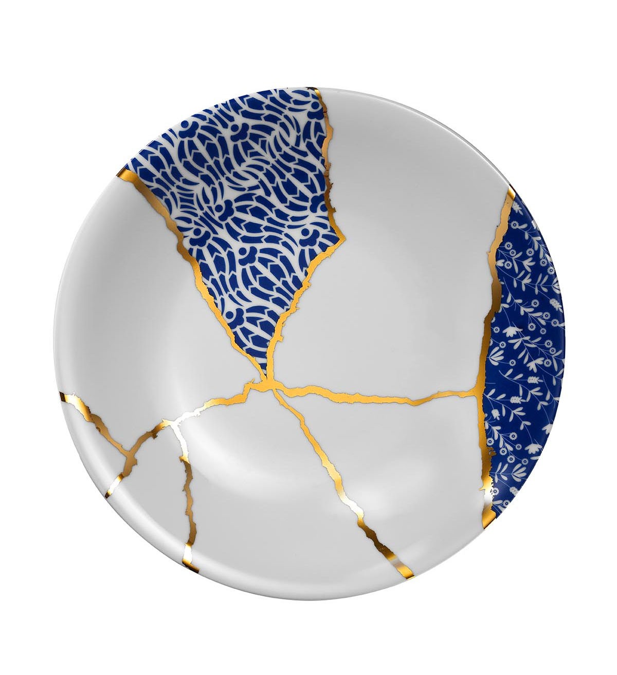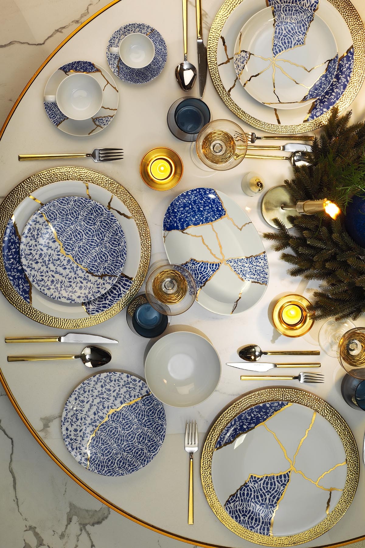 This special collection, named after the Japanese philosophy 'kintsugi', combines broken items with gold. its spiritual richness and blue color that reminds us to see the beauty in imperfections. brings together the depth of white.