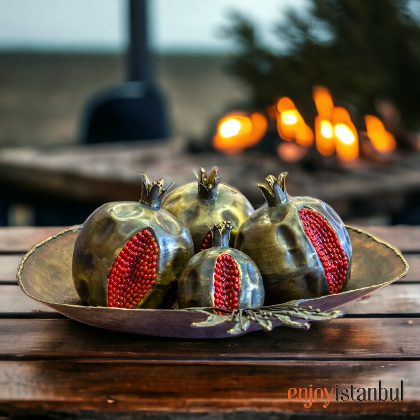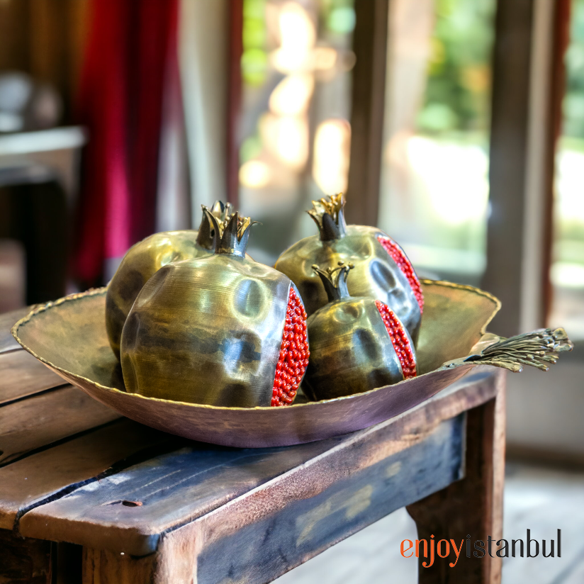 This elegant set offers an artisanal brass pomegranate masterpiece and a complementary pomegranate tray, both expertly crafted from hand-hammered brass. The pomegranate is widely regarded in Eastern cultures as a symbol of abundance and prosperity, and these handcrafted masterpieces reflect the fusion of traditional design and artistic craftsmanship. Meticulously worked upon in every detail, these pieces offer an elegant expression and a unique aesthetic. Enhancing both your interior decor and practical serving needs, this set serves as a striking work of art and a functional serving platter.