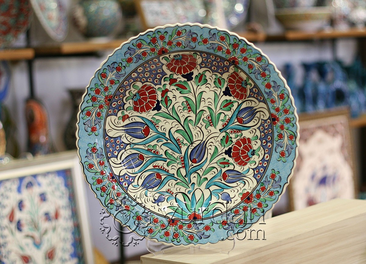 This decorative plate is one of the most beautiful examples of Iznik tile art. You can have the privilege of owning a unique piece of traditional Turkish pottery with this plate, which is handcrafted by our talented artists.