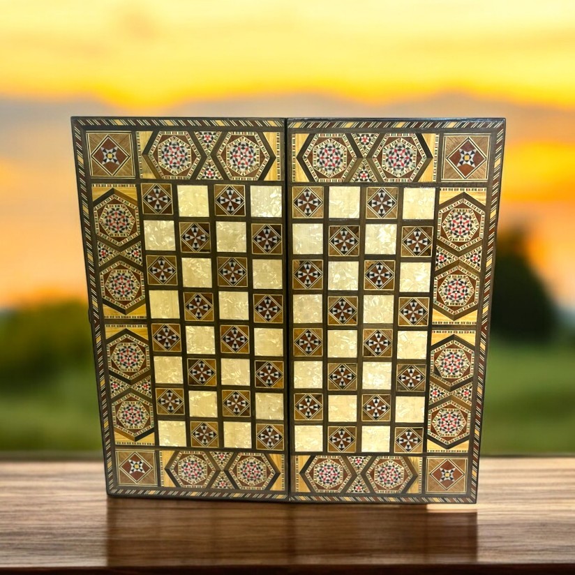 This exquisite handmade backgammon set is crafted with care and precision, showcasing traditional artistry. The natural wooden finish is enhanced with elegant mother-of-pearl inlays, creating a harmonious and timeless design. Its symmetrical patterns and eye-catching star motifs make it not only a functional game board but also a decorative piece of art. Perfect for collectors or as a thoughtful gift, this set reflects both quality and elegance.